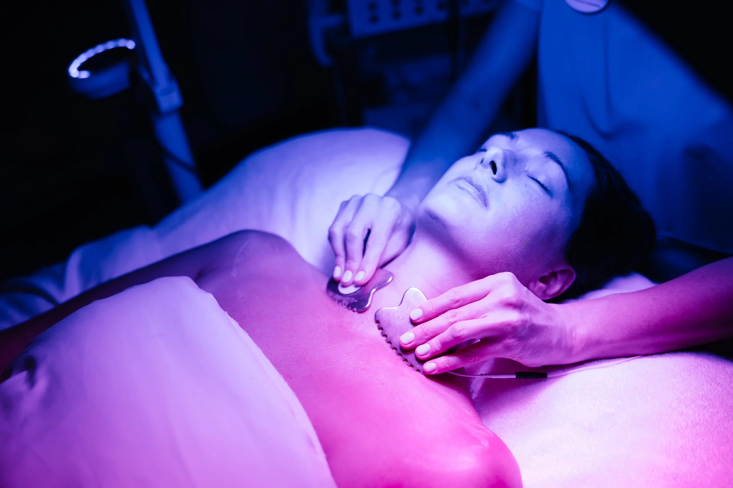 Gua Sha and facial cupping are traditional therapeutic techniques that use gentle, targeted movements to stimulate circulation, release muscle tension, and support lymphatic drainage. Gua Sha uses smooth stone tools to glide along the facial contours, while facial cupping uses soft silicone cups to create a light suction that lifts and decompresses the tissue.